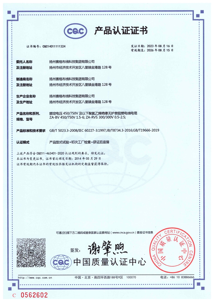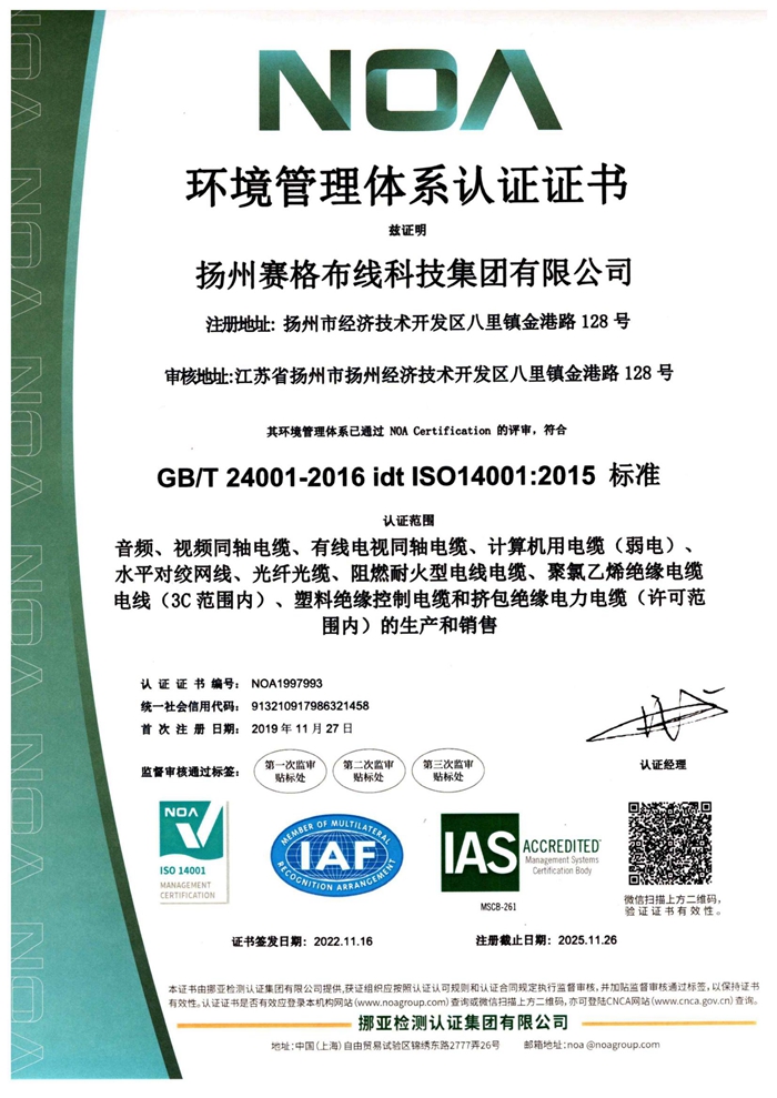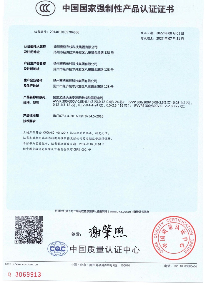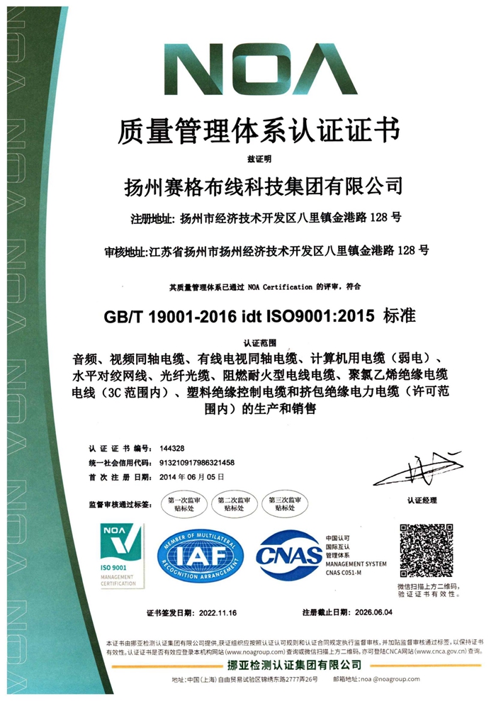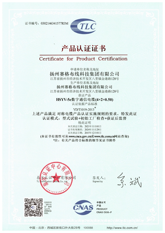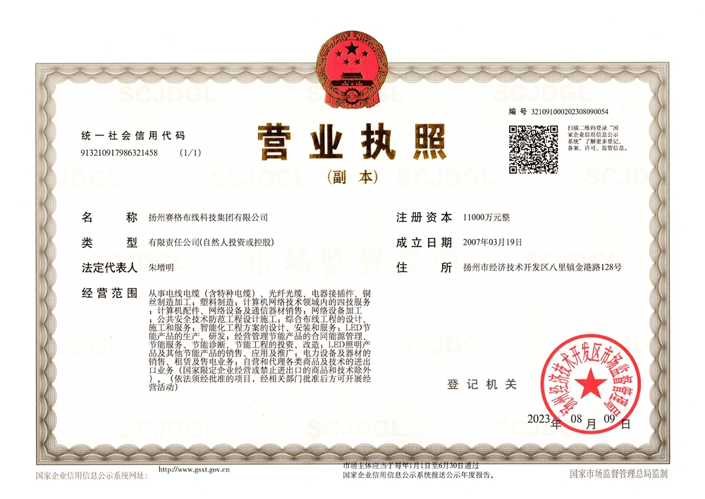 “賽格集團”位于美麗的揚州,公司占地面積106800平方米,固定資產(chǎn)20000萬(wàn)元,職工近千人,其中各類(lèi)專(zhuān)業(yè)技術(shù)人員過(guò)百人,系中國安全防范產(chǎn)品行業(yè)協(xié)會(huì )理事單位。公司擁有各種先進(jìn)的綜合布線(xiàn)產(chǎn)品及線(xiàn)纜制造和實(shí)驗檢測設備,產(chǎn)品嚴格按照國家標準或行業(yè)標準組織生產(chǎn),并已獲得國家質(zhì)量認證中心CQC頒發(fā)的CCC證書(shū)和上海挪亞檢測認證集團有限公司頒發(fā)的ISO9001:2015證書(shū),泰爾認證中心頒發(fā)的“泰爾認證”等!