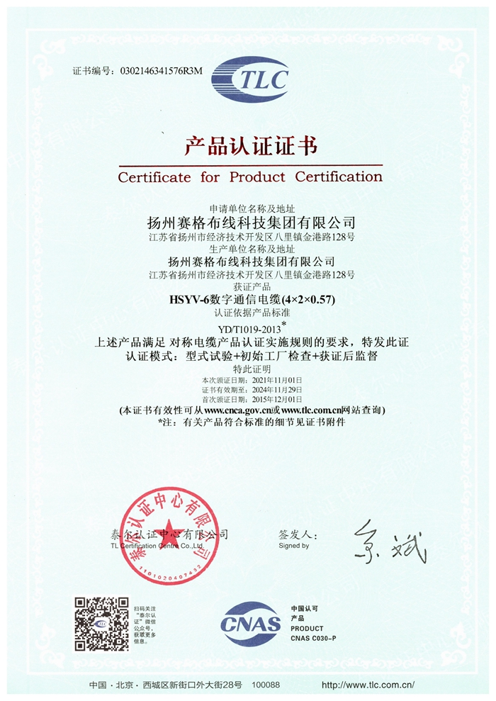 “賽格集團”位于美麗的揚州,公司占地面積106800平方米,固定資產(chǎn)20000萬(wàn)元,職工近千人,其中各類(lèi)專(zhuān)業(yè)技術(shù)人員過(guò)百人,系中國安全防范產(chǎn)品行業(yè)協(xié)會(huì )理事單位。公司擁有各種先進(jìn)的綜合布線(xiàn)產(chǎn)品及線(xiàn)纜制造和實(shí)驗檢測設備,產(chǎn)品嚴格按照國家標準或行業(yè)標準組織生產(chǎn),并已獲得國家質(zhì)量認證中心CQC頒發(fā)的CCC證書(shū)和上海挪亞檢測認證集團有限公司頒發(fā)的ISO9001:2015證書(shū),泰爾認證中心頒發(fā)的“泰爾認證”等!